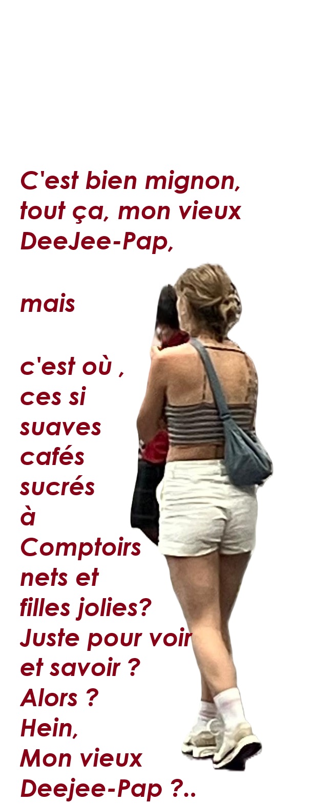 Et maintenant, retour à Belleville, DeeJeePAP/75, individu déclaré sans activité connue – sauf d’évanescents bénévolats. Et l’obsession du clavier.« Je lis tes posts, même si je ne les apprécie pas tous autant », dit Michel, le plus récent ami, et le déjeuner partagé n’en est que