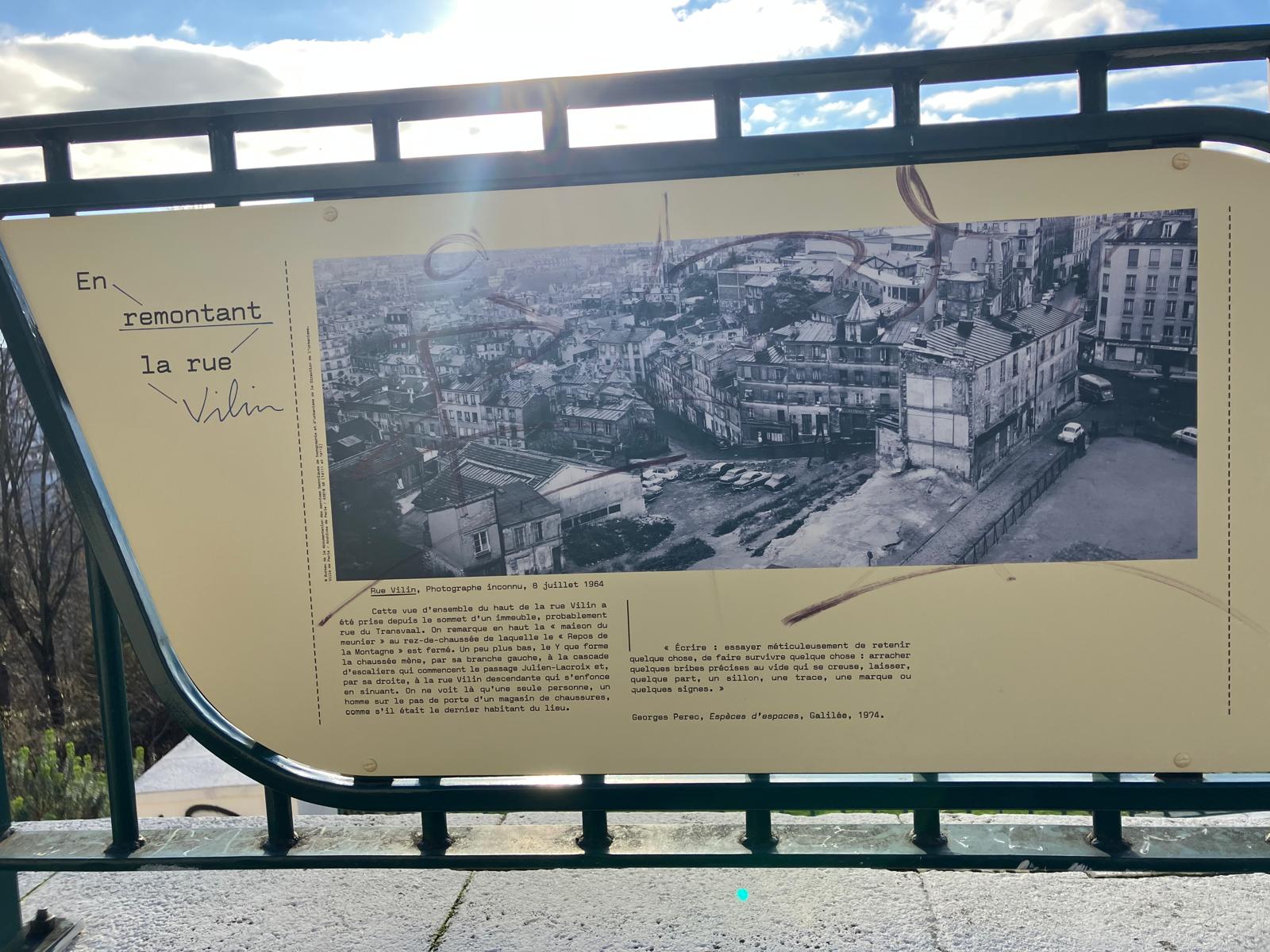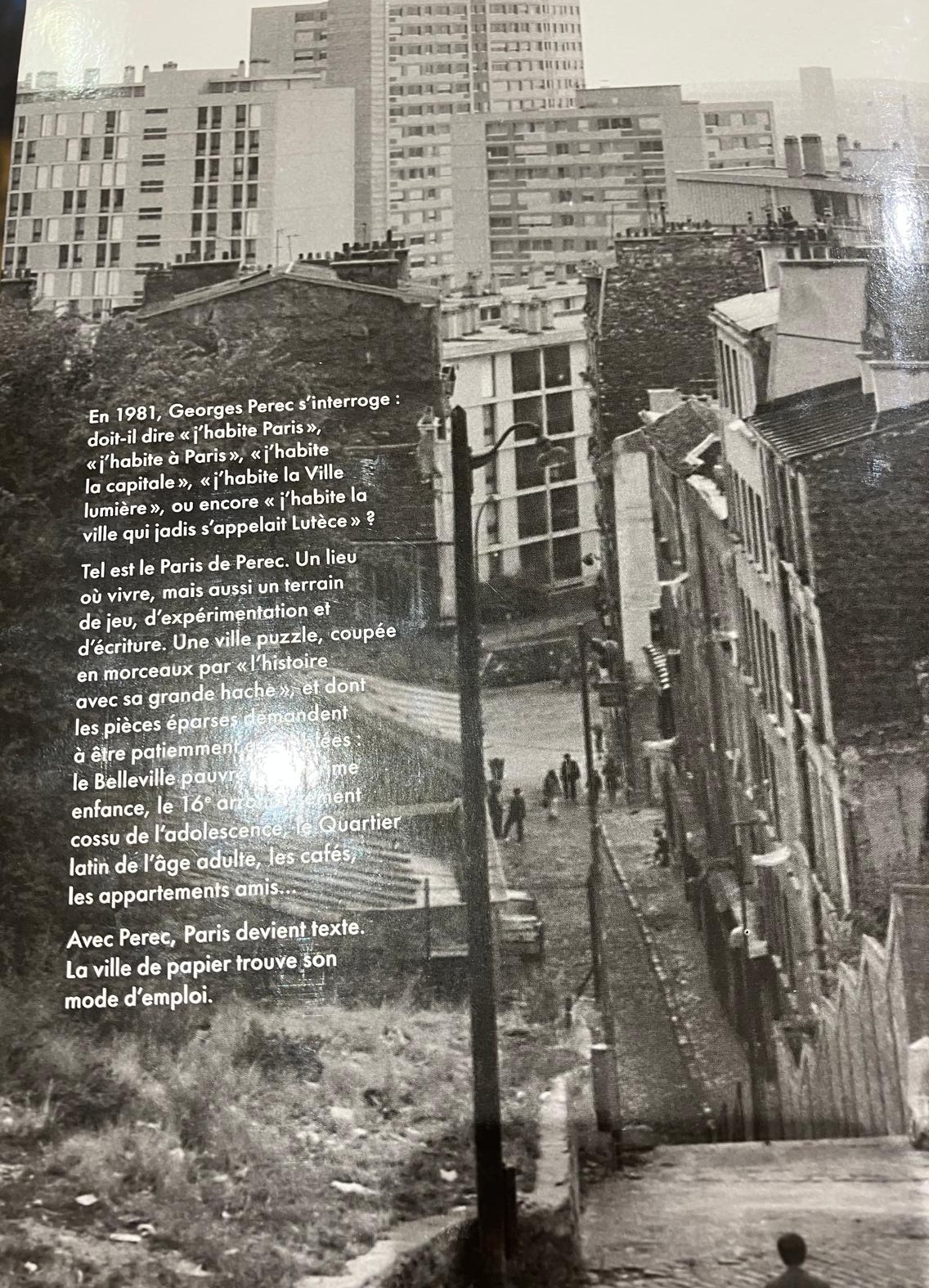 ; ou encore derrière la machine à coiffer de la mère Perec, Cyrla SZULEWICZ, rue Vilin déjà depuis dix ans déclarée insalubre, et le 4 mars 1982, au lendemain de la mort de Georges-son-fils, la ruine-maison fut détruite pour amorcer le parc destiné aux nouvelles classes moyennes du « Village Belleville »;